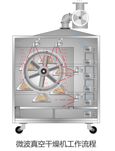真空微波干燥設備是一項在真空狀態下采用微波對物料進行低溫隔氧干燥的新技術。設備在真空條件下,通過降低水分沸點,使微波快速作用于物料,快速蒸發水分,達到干燥的目的。物料脫水溫度可控在55攝氏度以下,因而物料變形小,營養成分損失低。